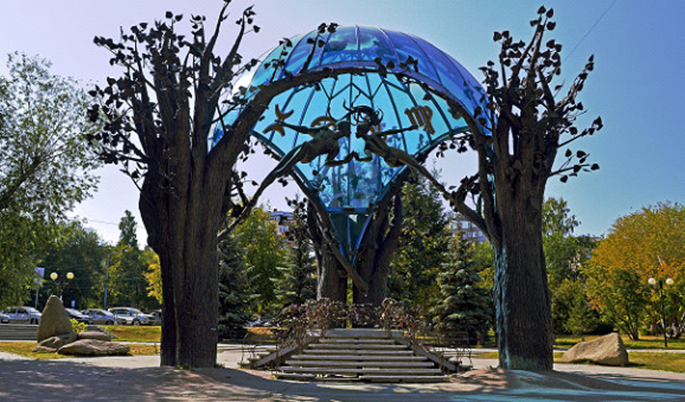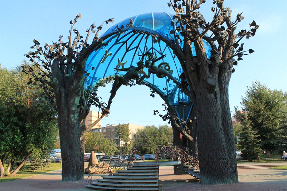 Скульптурная композиция была установлена в сентябре 2000 г. Ее открытие приурочили ко дню празднования 264-летнего юбилея города Челябинска. Над созданием композиции работала группа мастеров под руководством скульптора. Стеклянный купол изготовливался в Италии. Общая высота композиции составила 12 м, а диаметр купола - 10м