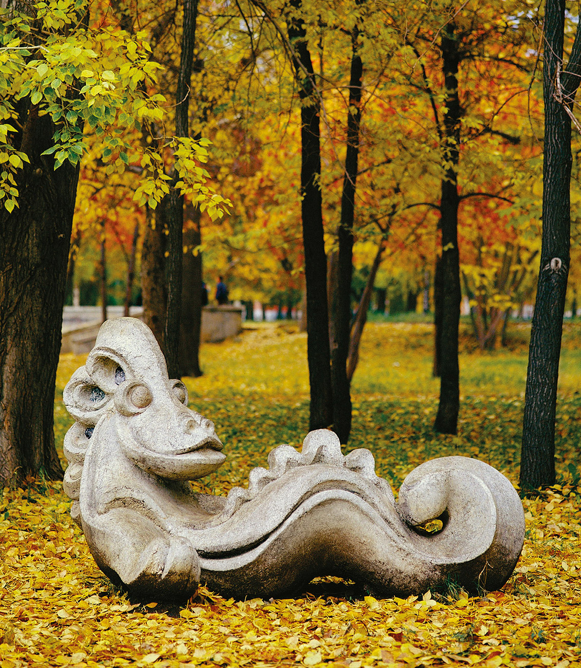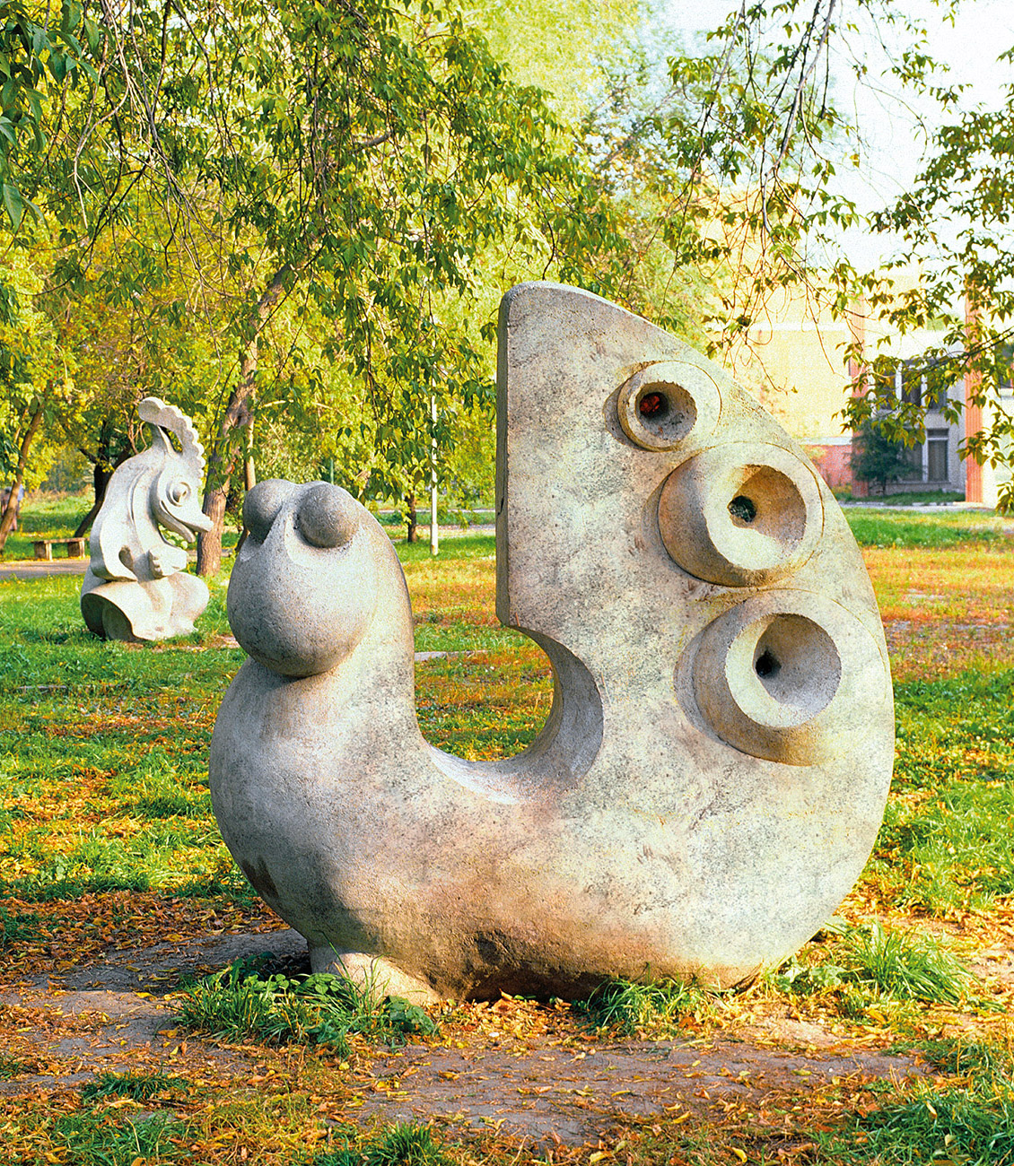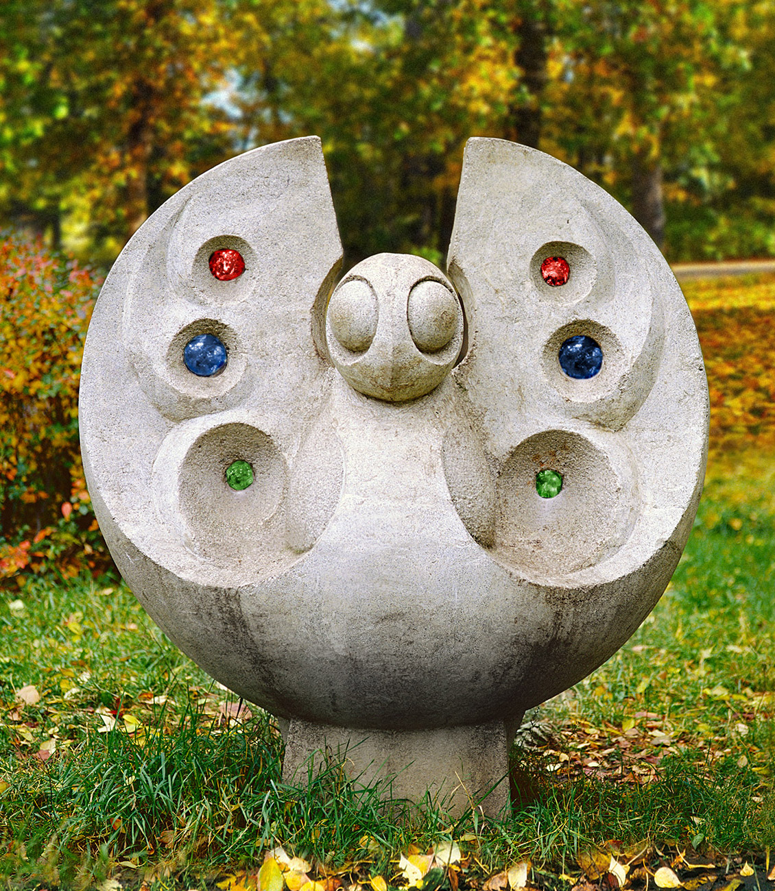Три опоры символизируют Древо жизни; купол над ними — Небесный свод; парящие, устремленные навстречу друг другу фигуры юноши и девушки олицетворяют вечное влечение к любви и обладанию.